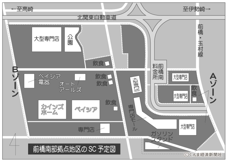 流通大手のベイシア(前橋市亀里町、高山正雄社長)は来年にも、前橋南部と太田南部に大規模ショッピングセンター(SC)を開業する。前橋のSCは敷地面積約23万平方メートル、1万平方メートルクラスの店舗4棟などの集積で商業施設面積は6万平方㍍超と、県内最大級のSCとなる見込み。
