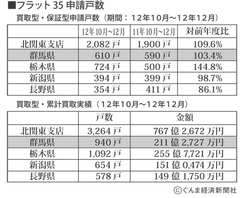 住宅金融支援機構北関東支店(前橋市千代田町、元木周二支店長)がこのほどまとめた12年度第3四半期(12年10〜12月)の長期固定金利型住宅ローン「フラット35」の県内申請戸数は、前年同期比3・4%増の610戸となり、今期に入って初めて
