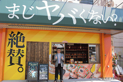 インパクトのある外観の店舗の前でキャラクターと同じポーズをとる山本社長