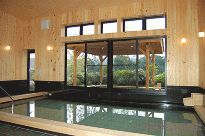 広々とした内風呂と窓の外には露天風呂がある