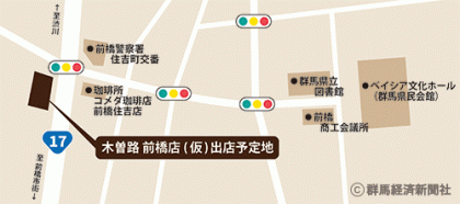しゃぶしゃぶ・日本料理店を展開する木曽路(名古屋市、吉江源之社長)は来春にも、国道17号線沿い前橋市住吉町交番前交差点の角に「木曽路前橋店(仮)」(同市住吉町)をオープンする。県内では高崎店(高崎市上大類町)に次ぐ2店目で、北関東地区への出店強化の一環となる。