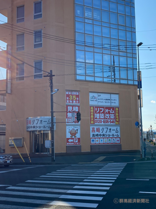 高崎中央ショールームの開設場所は、高崎環状線と県道高崎駒形線との交差点にあるビルの1、2階。自動車通行量が毎時500台以上の幹線道路沿い、200メートル手前からの視認性などから選定した。