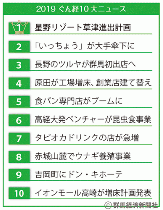 「群馬」と「経済」を選考基準に、各分野の担当記者による投票で決定する恒例の「ぐん経10大ニュース」。2019年のトップは「星野リゾート草津進出計画」だった。さまざまな個性的な宿泊施設を展開し、知名度も高い星野リゾートの計画だけに、最も票を集めた。2位には「いっちょうが大手傘下に」、3位に「長野のツルヤが群馬初出店へ」が入った。また、「食パン」「タピオカ」など全国的にブームとなったワードもランクインした。