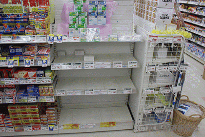 品切れ状態のマスク売り場(マルエドラッグ川原店)