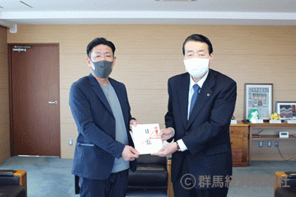 谷津社長(左)から五十嵐市長へ目録が手渡された