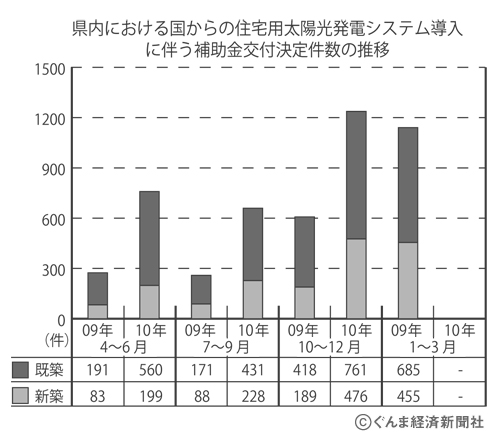 太陽光発電普及拡大センター(J−PEC)がこのほどまとめた住宅用の「10年度太陽光発電システム補助金交付件数」によると、10年12月末現在の県内の導入件数は前年同期と比べて約1・6倍の2655件に拡大し、このうち新築時に導入する割合が全体の34%を占め、前年の割合を大きく上回っていることが分かった。
